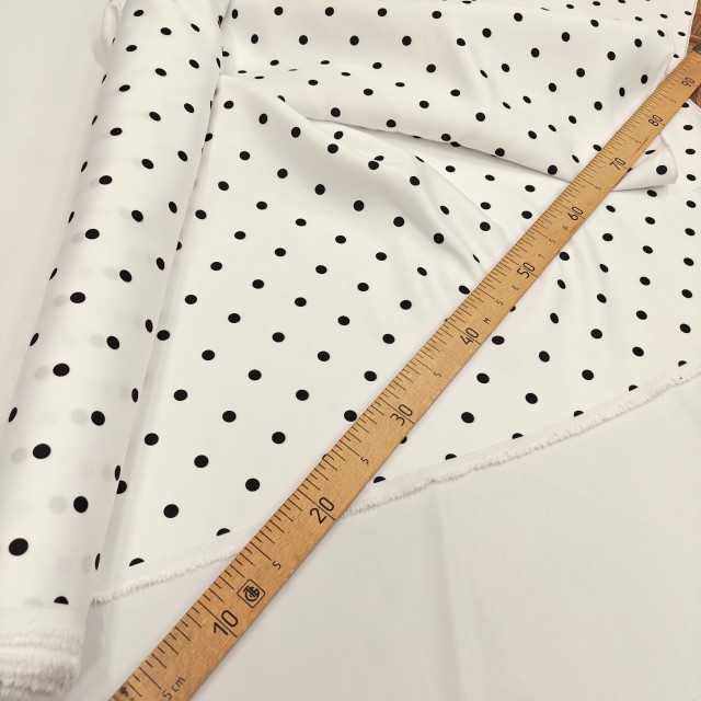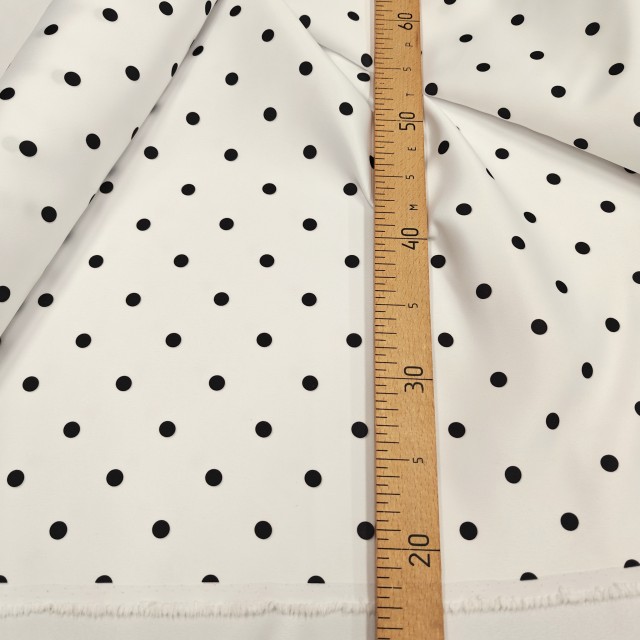- Атлас матовый Абрахам белый в мелкий черный горох для шитья платьев