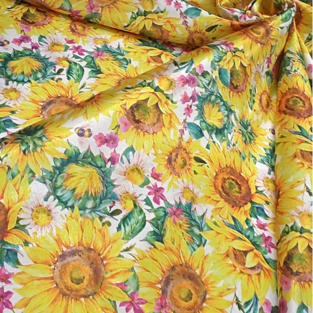 - Атлас с блеском Кристалл с солнечными подсолнухами для пошива нарядных платьев